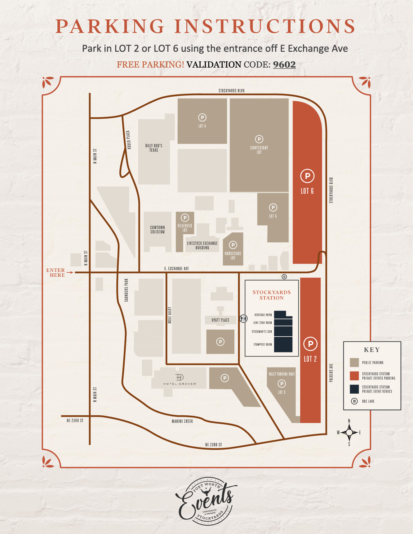 This lot is accessed by turning onto Stockman’s Drive from 23rd Street (east of Hotel Drover).